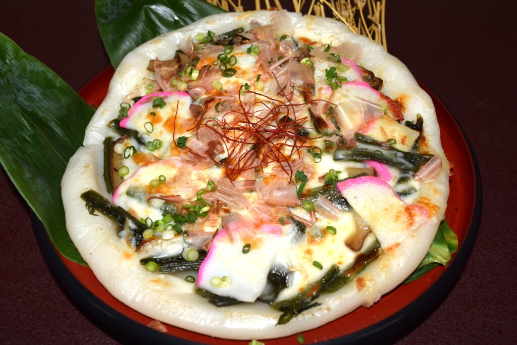 あんぼならではのもちもちとした生地に、地元で採れた山菜をたっぷりとトッピングし、チーズで香ばしく焼き上げました。